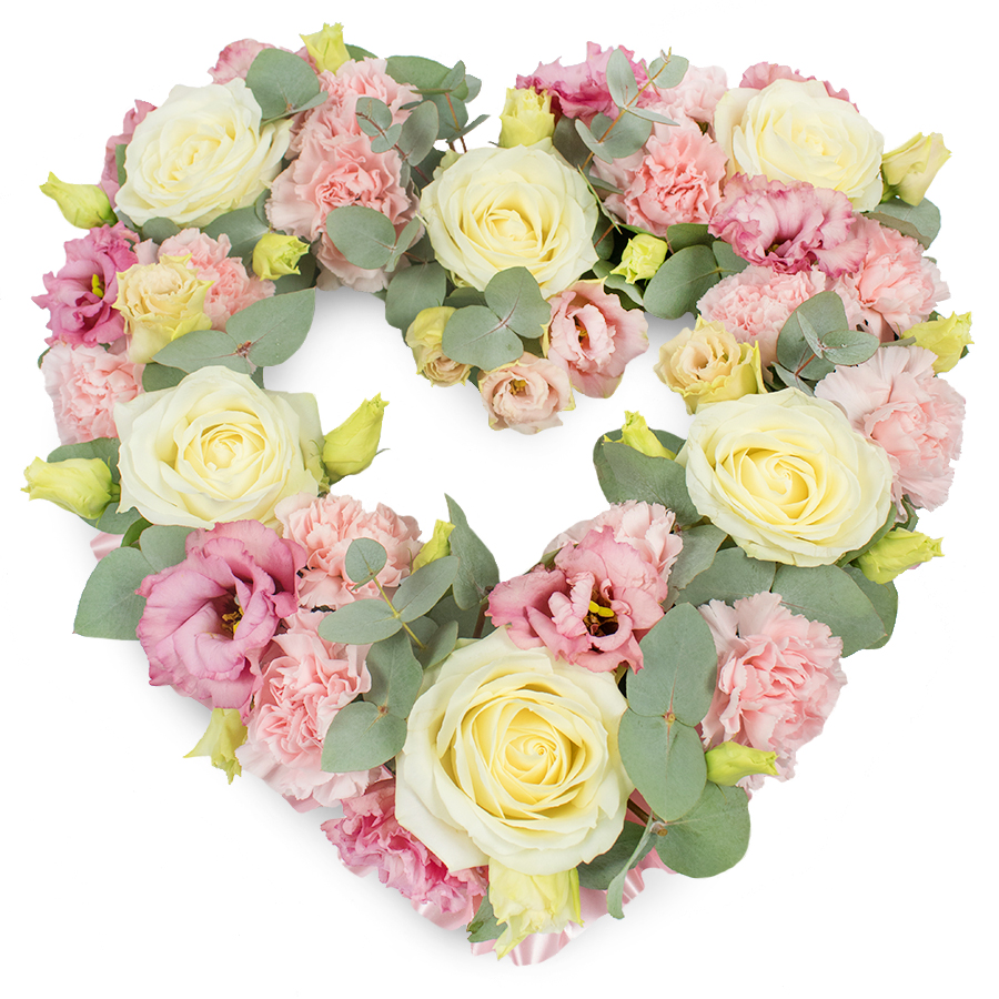 Our graceful heart floral arrangement is designed to express your deepest emotions with elegance. Featuring a harmonious mix of white roses, pink carnations, pink lisianthus, and eucalyptus, this bouquet embodies beauty and sentiment.