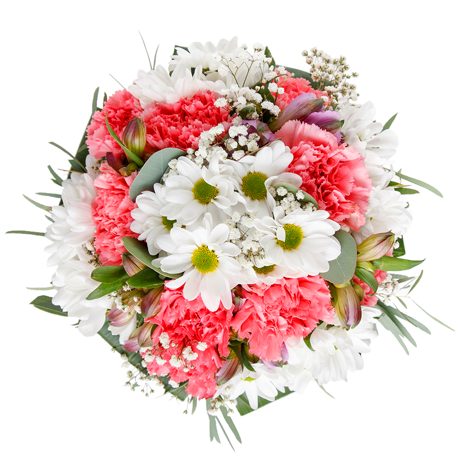 The bouquet features a harmonious blend of snow-white chrysanthemums, delicate gypsophila, and soft light pink carnations, all beautifully wrapped in lush aspidistra leaves.